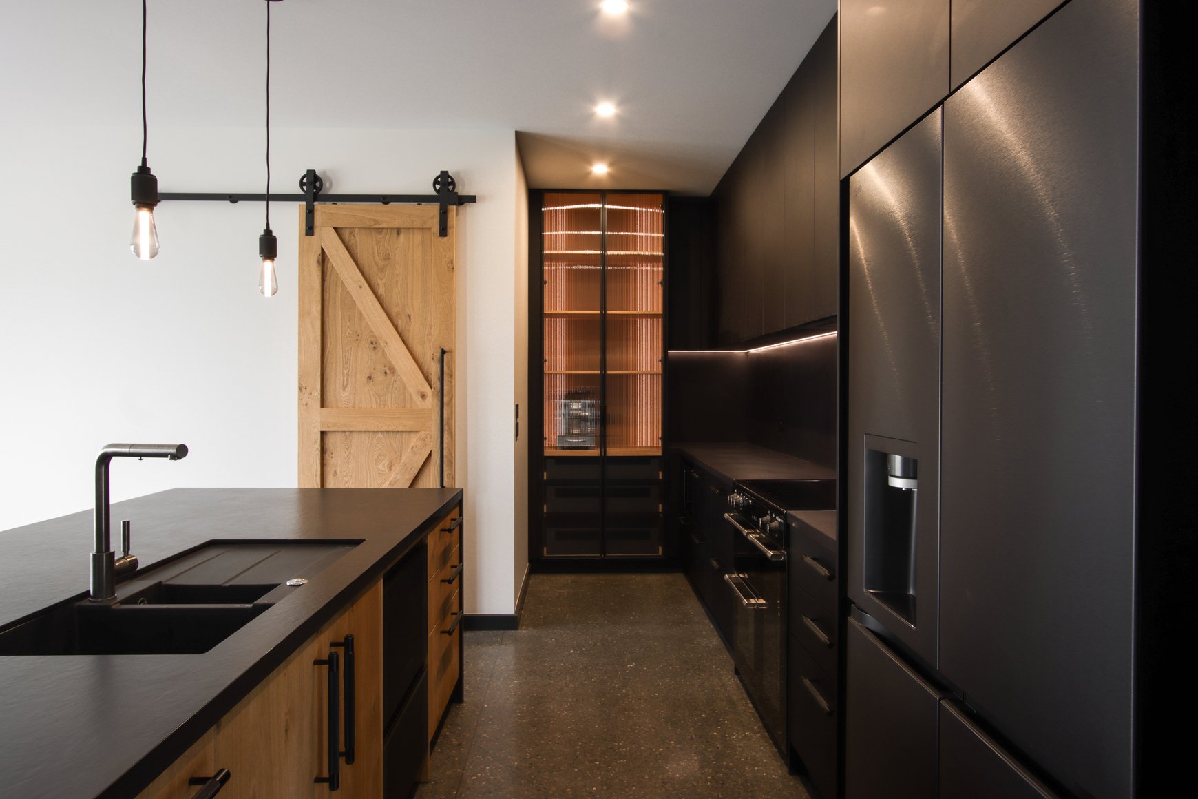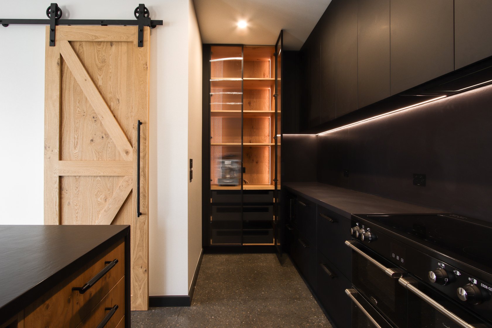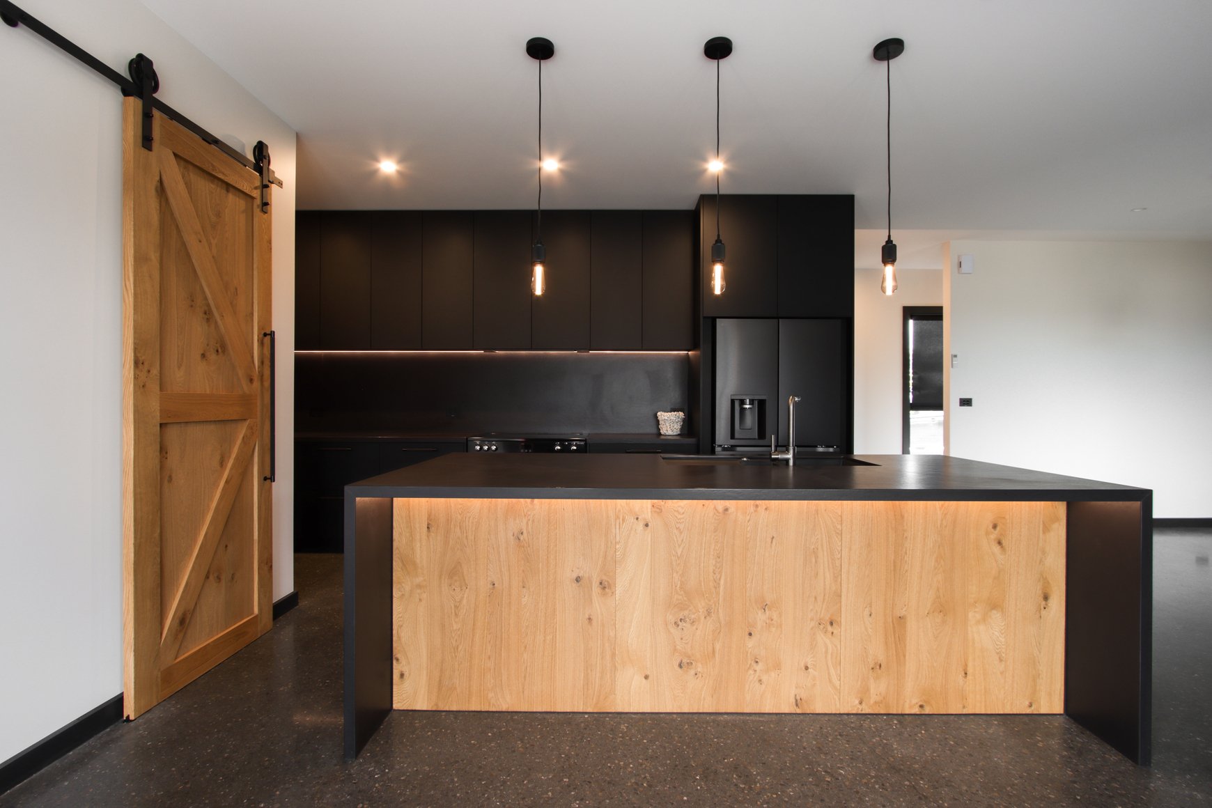 This striking kitchen blends modern design with rustic warmth. Matte black cabinetry provides a sleek, refined base, beautifully contrasted by natural timber veneer detailing on the island and barn door. Clean lines, a minimalist palette, and subtle LED lighting create a sophisticated atmosphere, while the concrete flooring adds an industrial edge.